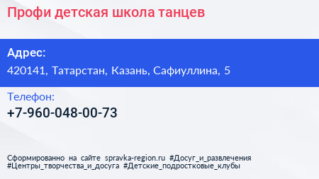 Профи, детская школа танцев по адресу 420141, Татарстан, Казань, Сафиуллина, 5 в дальнейшем Организация, размещена в следующих категориях: