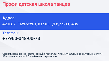 Профи, детская школа танцев по адресу 420087, Татарстан, Казань, Даурская, 48в в дальнейшем Организация, размещена в следующих категориях: