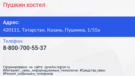 Пушкин, хостел по адресу 420111, Татарстан, Казань, Пушкина, 1/55а в дальнейшем Организация, размещена в следующих категориях: