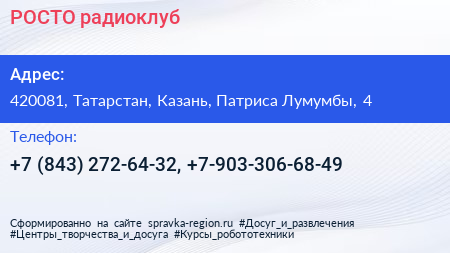 РОСТО, радиоклуб по адресу 420081, Татарстан, Казань, Патриса Лумумбы, 4 в дальнейшем Организация, размещена в следующих категориях: