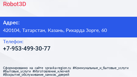 Robot3D по адресу 420104, Татарстан, Казань, Рихарда Зорге, 60 в дальнейшем Организация, размещена в следующих категориях: