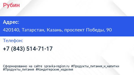 Рубин по адресу 420140, Татарстан, Казань, проспект Победы, 90 в дальнейшем Организация, размещена в следующих категориях:
