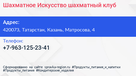 Шахматное Искусство, шахматный клуб по адресу 420073, Татарстан, Казань, Матросова, 4 в дальнейшем Организация, размещена в следующих категориях: