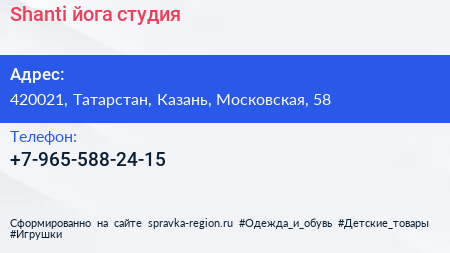 Shanti, йога-студия по адресу 420021, Татарстан, Казань, Московская, 58 в дальнейшем Организация, размещена в следующих категориях: