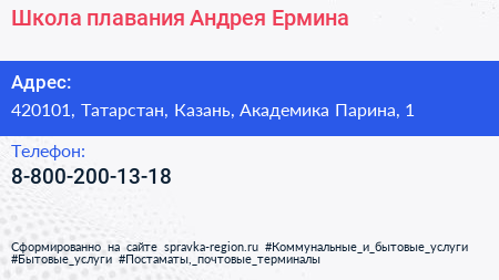 Школа плавания Андрея Ермина по адресу 420101, Татарстан, Казань, Академика Парина, 1 в дальнейшем Организация, размещена в следующих категориях: