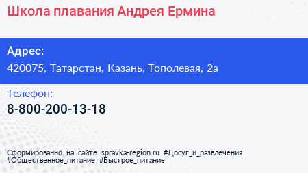 Школа плавания Андрея Ермина по адресу 420075, Татарстан, Казань, Тополевая, 2а в дальнейшем Организация, размещена в следующих категориях: