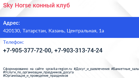 Sky Horse, конный клуб по адресу 420130, Татарстан, Казань, Центральная, 1а в дальнейшем Организация, размещена в следующих категориях:
