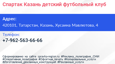 Спартак Казань, детский футбольный клуб по адресу 420101, Татарстан, Казань, Хусаина Мавлютова, 4 в дальнейшем Организация, размещена в следующих категориях: