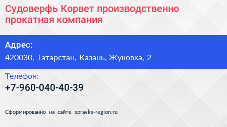 Судоверфь Корвет, производственно-прокатная компания по адресу 420030, Татарстан, Казань, Жуковка, 2 в дальнейшем Организация, размещена в следующих категориях: