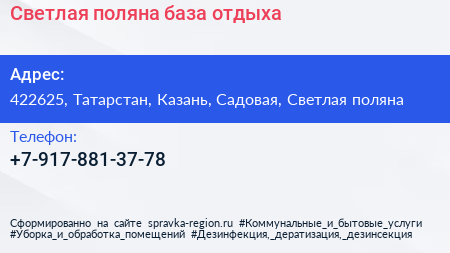 Светлая поляна, база отдыха по адресу 422625, Татарстан, Казань, Садовая, Светлая поляна в дальнейшем Организация, размещена в следующих категориях:
