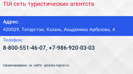 TUI, сеть туристических агентств по адресу 420029, Татарстан, Казань, Академика Арбузова, 4 в дальнейшем Организация, размещена в следующих категориях: