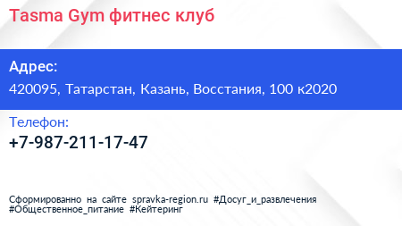 Tasma Gym, фитнес-клуб по адресу 420095, Татарстан, Казань, Восстания, 100 к2020 в дальнейшем Организация, размещена в следующих категориях: