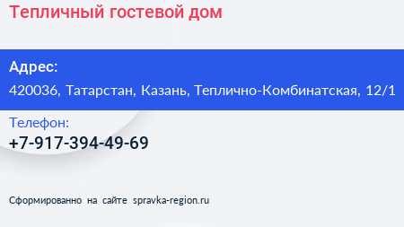 Тепличный, гостевой дом по адресу 420036, Татарстан, Казань, Теплично-Комбинатская, 12/1 в дальнейшем Организация, размещена в следующих категориях: