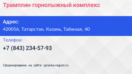 Трамплин, горнолыжный комплекс по адресу 420056, Татарстан, Казань, Таёжная, 40 в дальнейшем Организация, размещена в следующих категориях: