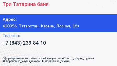 Три Татарина, баня по адресу 420056, Татарстан, Казань, Лесная, 18а в дальнейшем Организация, размещена в следующих категориях: