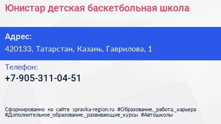 Юнистар, детская баскетбольная школа по адресу 420133, Татарстан, Казань, Гаврилова, 1 в дальнейшем Организация, размещена в следующих категориях: