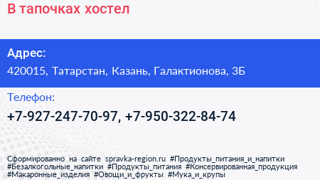 В тапочках, хостел по адресу 420015, Татарстан, Казань, Галактионова, 3Б в дальнейшем Организация, размещена в следующих категориях: