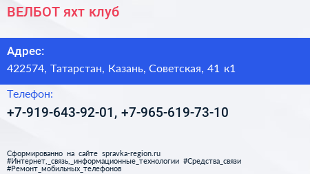 ВЕЛБОТ, яхт-клуб по адресу 422574, Татарстан, Казань, Советская, 41 к1 в дальнейшем Организация, размещена в следующих категориях: