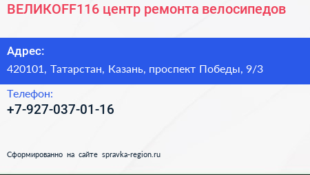 ВЕЛИКОFF116, центр ремонта велосипедов по адресу 420101, Татарстан, Казань, проспект Победы, 9/3 в дальнейшем Организация, размещена в следующих категориях: