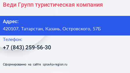 Веди Групп, туристическая компания по адресу 420107, Татарстан, Казань, Островского, 57Б в дальнейшем Организация, размещена в следующих категориях: