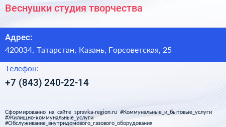 Веснушки, студия творчества по адресу 420034, Татарстан, Казань, Горсоветская, 25 в дальнейшем Организация, размещена в следующих категориях: