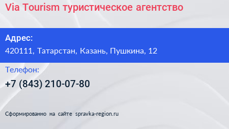 Via Tourism, туристическое агентство по адресу 420111, Татарстан, Казань, Пушкина, 12 в дальнейшем Организация, размещена в следующих категориях: