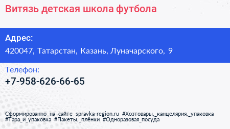 Витязь, детская школа футбола по адресу 420047, Татарстан, Казань, Луначарского, 9 в дальнейшем Организация, размещена в следующих категориях: