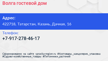 Волга, гостевой дом по адресу 422718, Татарстан, Казань, Дачная, 16 в дальнейшем Организация, размещена в следующих категориях: