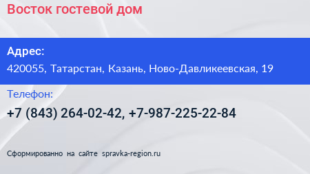 Восток, гостевой дом по адресу 420055, Татарстан, Казань, Ново-Давликеевская, 19 в дальнейшем Организация, размещена в следующих категориях: