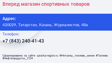 Вперед, магазин спортивных товаров по адресу 420029, Татарстан, Казань, Журналистов, 48а в дальнейшем Организация, размещена в следующих категориях:
