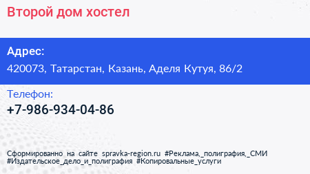 Второй дом, хостел по адресу 420073, Татарстан, Казань, Аделя Кутуя, 86/2 в дальнейшем Организация, размещена в следующих категориях: