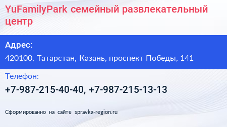 YuFamilyPark, семейный развлекательный центр по адресу 420100, Татарстан, Казань, проспект Победы, 141 в дальнейшем Организация, размещена в следующих категориях:
