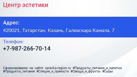 Центр эстетики по адресу 420021, Татарстан, Казань, Галиаскара Камала, 7 в дальнейшем Организация, размещена в следующих категориях: