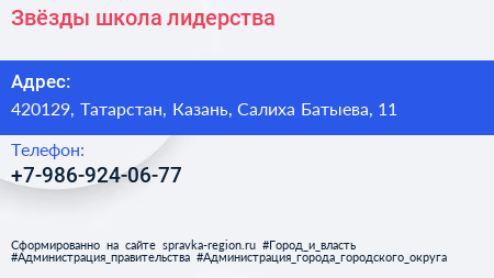 Звёзды, школа лидерства по адресу 420129, Татарстан, Казань, Салиха Батыева, 11 в дальнейшем Организация, размещена в следующих категориях:
