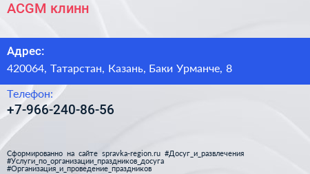 ACGM клинн по адресу 420064, Татарстан, Казань, Баки Урманче, 8 в дальнейшем Организация, размещена в следующих категориях: