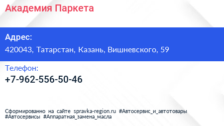 Академия Паркета по адресу 420043, Татарстан, Казань, Вишневского, 59 в дальнейшем Организация, размещена в следующих категориях: