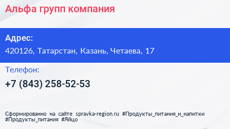 Альфа групп, компания по адресу 420126, Татарстан, Казань, Четаева, 17 в дальнейшем Организация, размещена в следующих категориях: