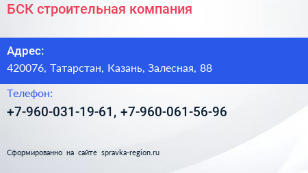 БСК, строительная компания по адресу 420076, Татарстан, Казань, Залесная, 88 в дальнейшем Организация, размещена в следующих категориях: