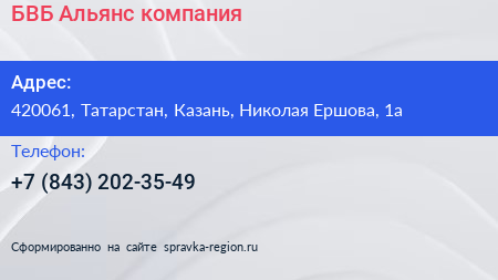 БВБ-Альянс, компания по адресу 420061, Татарстан, Казань, Николая Ершова, 1а в дальнейшем Организация, размещена в следующих категориях: