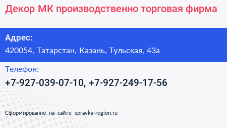 Декор МК, производственно-торговая фирма по адресу 420054, Татарстан, Казань, Тульская, 43а в дальнейшем Организация, размещена в следующих категориях: