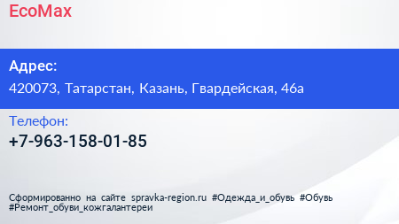 EcoMax по адресу 420073, Татарстан, Казань, Гвардейская, 46а в дальнейшем Организация, размещена в следующих категориях:
