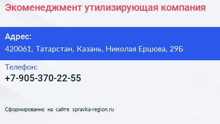 Экоменеджмент, утилизирующая компания по адресу 420061, Татарстан, Казань, Николая Ершова, 29Б в дальнейшем Организация, размещена в следующих категориях: