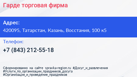Гарде, торговая фирма по адресу 420095, Татарстан, Казань, Восстания, 100 к5 в дальнейшем Организация, размещена в следующих категориях: