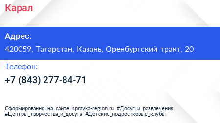 Карал по адресу 420059, Татарстан, Казань, Оренбургский тракт, 20 в дальнейшем Организация, размещена в следующих категориях: