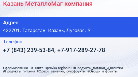 Для связи с организацией воспользуйтесь номером телефона: +7 (843) 239-53-84, +7-917-289-27-78. Пн: c 08:00-17:00, Вт: c 08:00-17:00, Ср: c 08:00-17:00, Чт: c 08:00-17:00, Пт: c 08:00-17:00, Сб: c 08:00-12:00, Вс: выходной, вы можете обратиться в эту организацию.