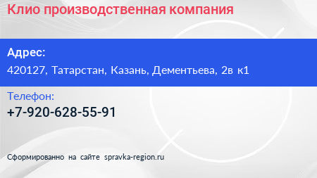 Клио, производственная компания по адресу 420127, Татарстан, Казань, Дементьева, 2в к1 в дальнейшем Организация, размещена в следующих категориях: