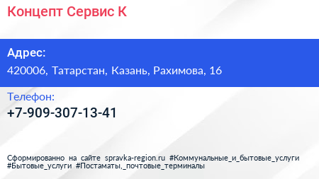 Концепт Сервис-К по адресу 420006, Татарстан, Казань, Рахимова, 16 в дальнейшем Организация, размещена в следующих категориях: