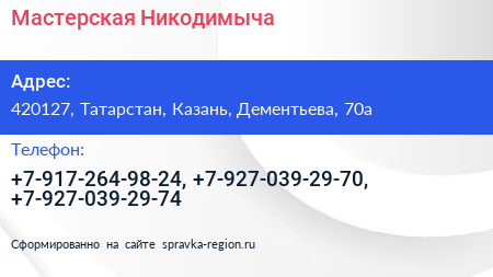 Мастерская Никодимыча по адресу 420127, Татарстан, Казань, Дементьева, 70а в дальнейшем Организация, размещена в следующих категориях: