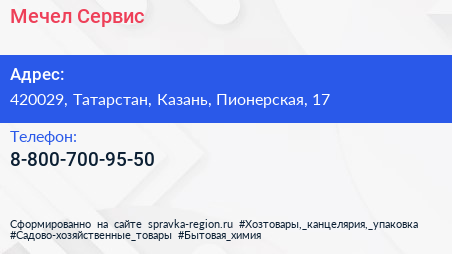 Мечел-Сервис по адресу 420029, Татарстан, Казань, Пионерская, 17 в дальнейшем Организация, размещена в следующих категориях: