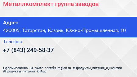 Металлкомплект, группа заводов по адресу 420005, Татарстан, Казань, Южно-Промышленная, 10 в дальнейшем Организация, размещена в следующих категориях: